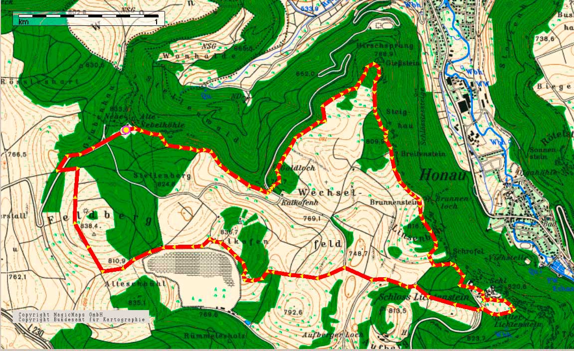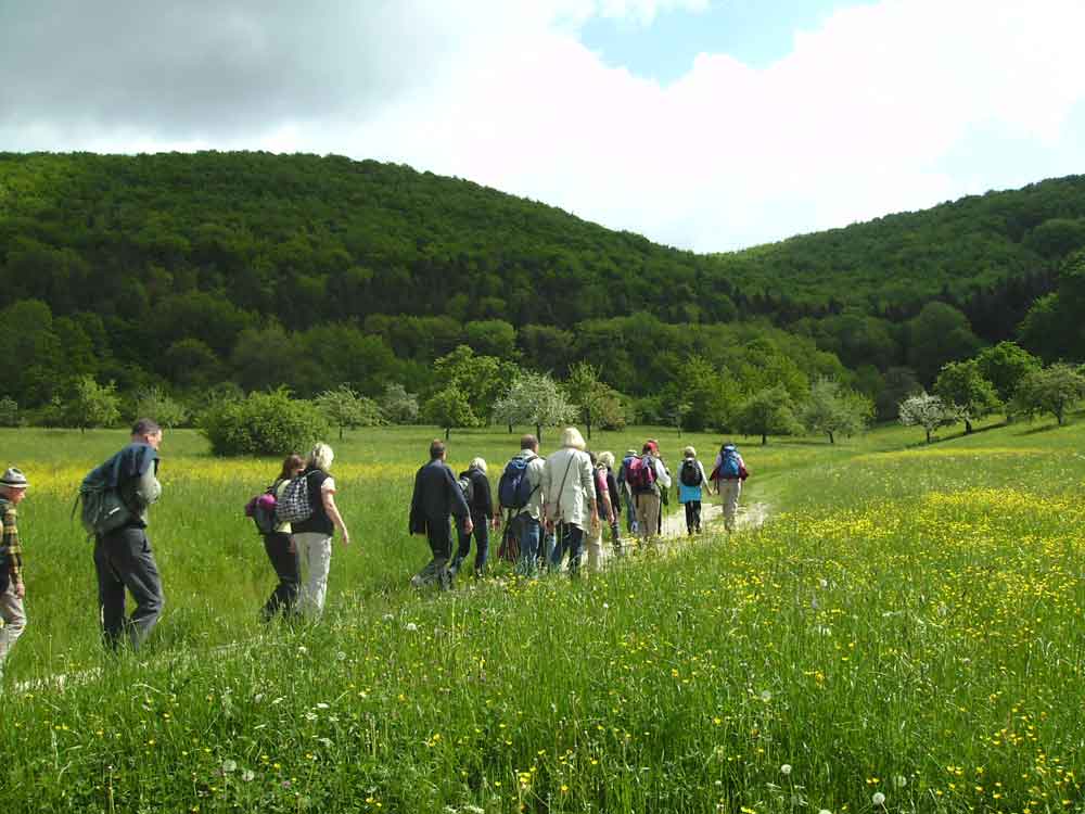Wander-Start ist an der Nebelhöhle. Unser Weg führt am Rand der Hochfläche zum Gießstein und folgt dem Rand des Echaztals hinauf auf den Lichtenstein. Über die Magerwiesen der Alb kommen wir an den Steinbruch bei Genkingen. Von dort sind wir bald wieder am Wanderparkplatz. Eine kleine Tour auf der Hochfläche ohne Aufstiege, dafür mit den schönsten Ausblicken ins Echaztal. Einkehr in der Schlossschenke beim Hochseilgarten. Einkehr